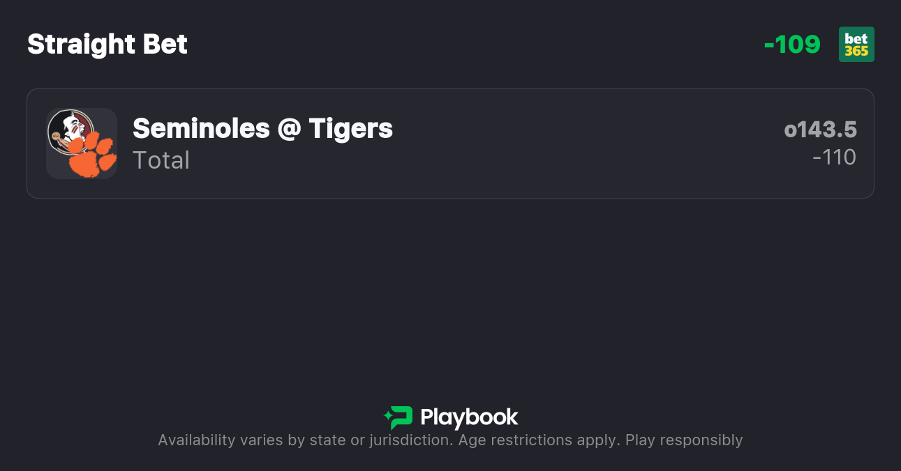 - Florida State vs Clemson over/under: 143.5 points