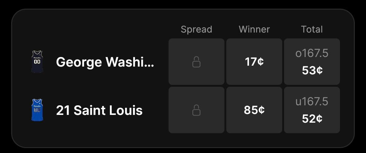 Saint Louis is favored with a price of 85 cents to win and the total set at 167.5 points on Fanatics Markets.