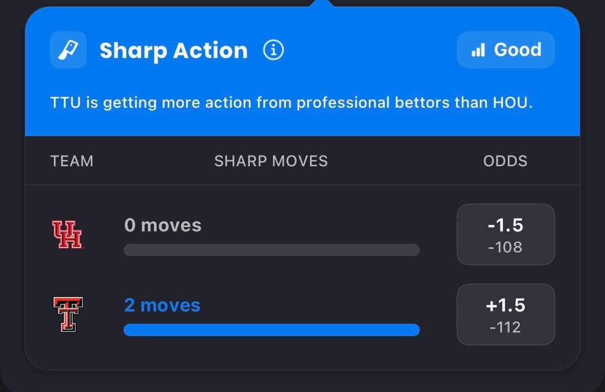 Also, as of writing, sharp money is coming in on Texas Tech, according to Action PRO.