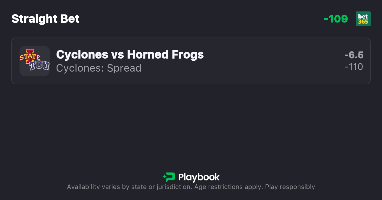 - Iowa State vs TCU moneyline: Iowa State -280, TCU +230