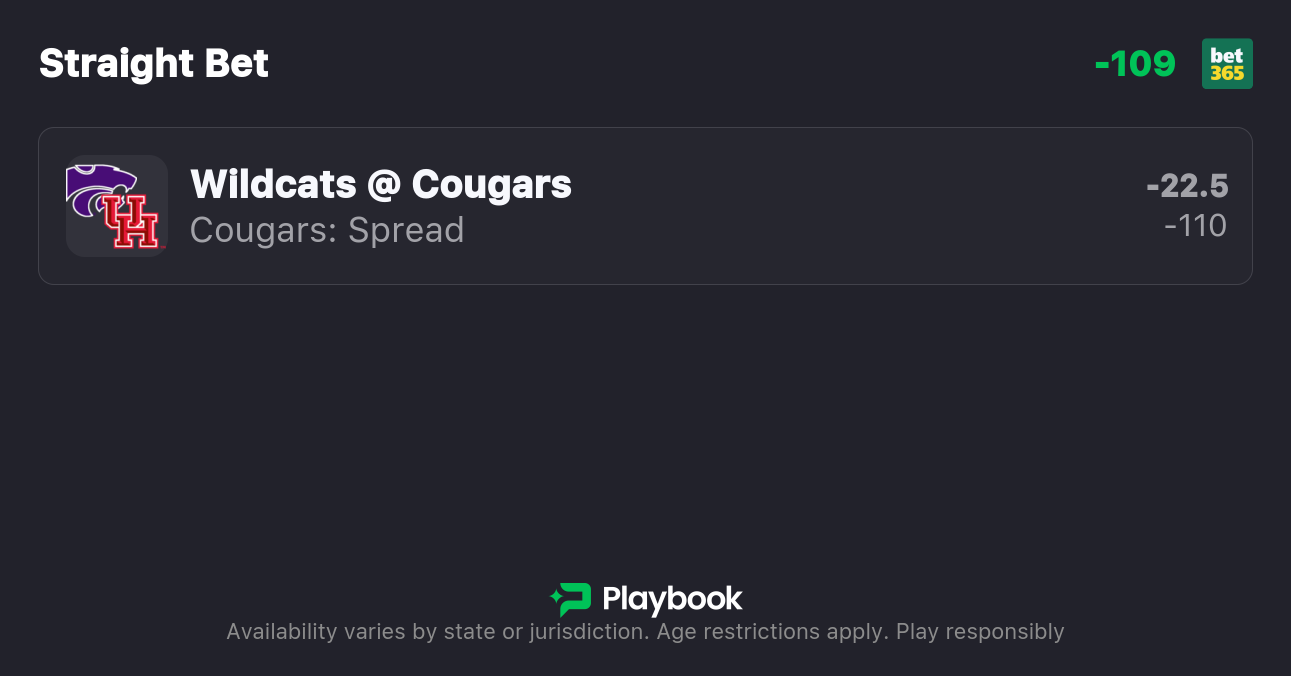 - Kansas State vs Houston Spread: Houston -22.5, Kansas State +22.5