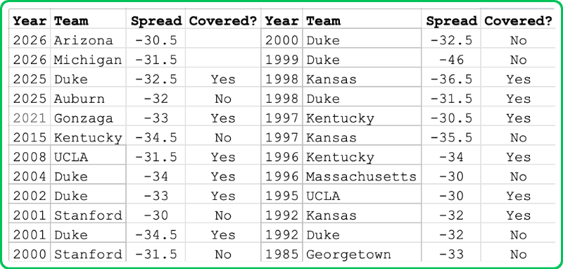 At the very top of the board, we’re also seeing the return — and expansion — of extreme mismatches. There are currently two favorites of 30 points or more — Michigan and Arizona — with Florida still expected to join that tier.