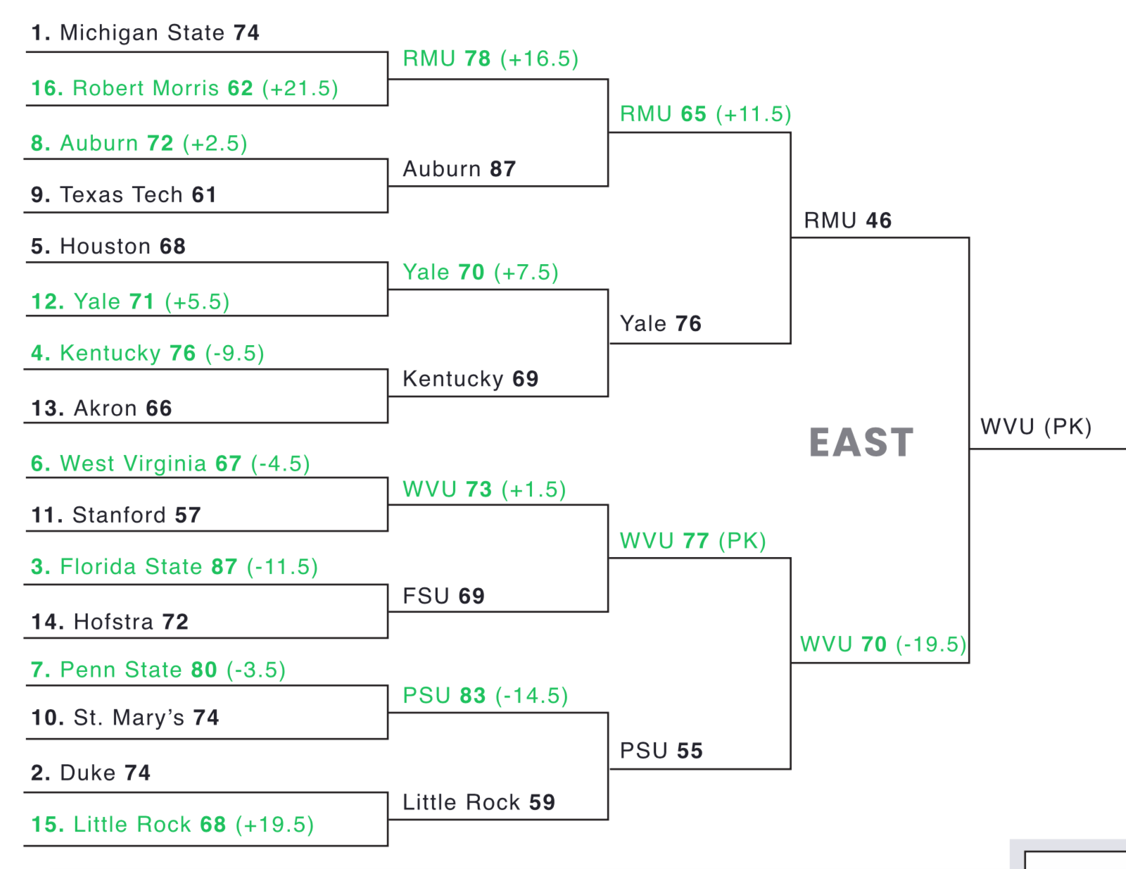 Reminder: The team that covers the spread is the team that advances in the March Sadness bracket.