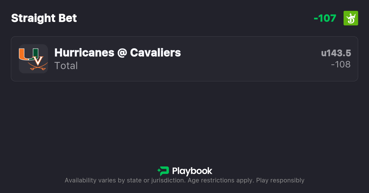 - Miami (FL) vs Virginia Over/Under: 143.5 points