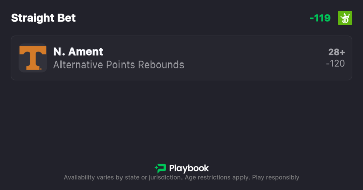My Pick: Nate Ament Over 27.5 Points & Rebounds | Tennessee 1H -5.5
