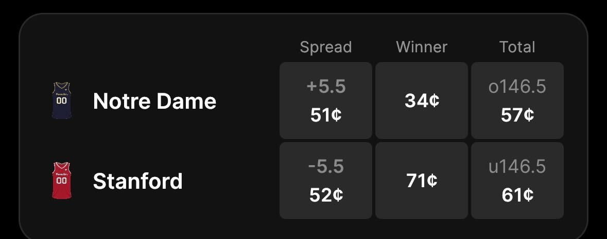Stanford favored by 5.5 points on the spread with a price of 71 cents to win and the total set at 146.5 points on Fanatics Markets.