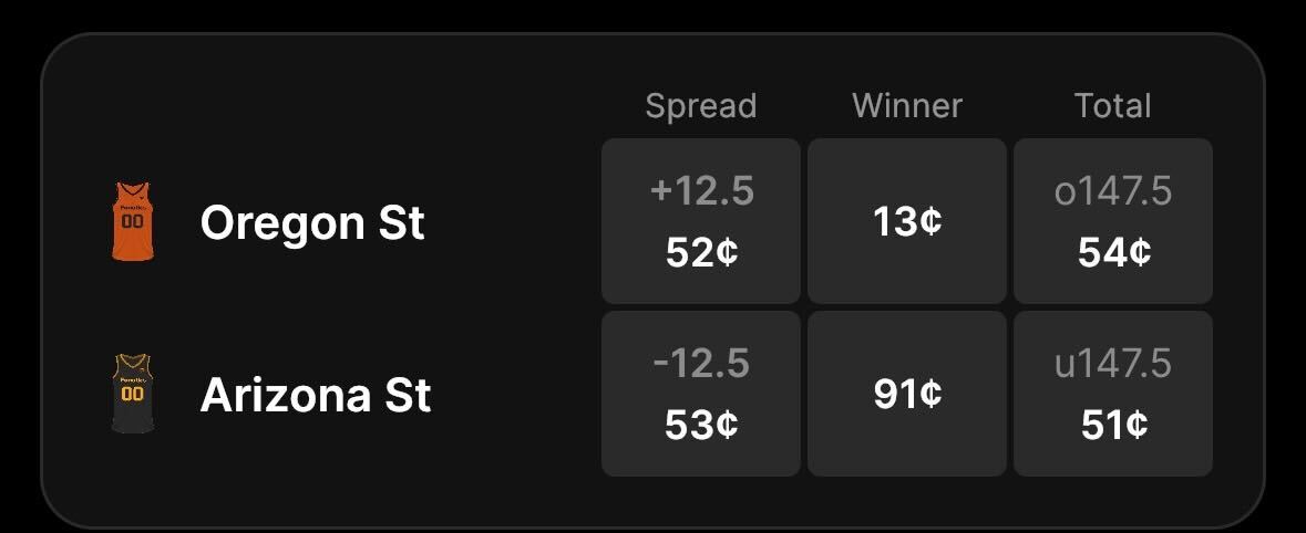 Arizona State favored by -12.5 points on the spread with a price of 91 cents to win and the total set at 147.5 points on Fanatics Markets.