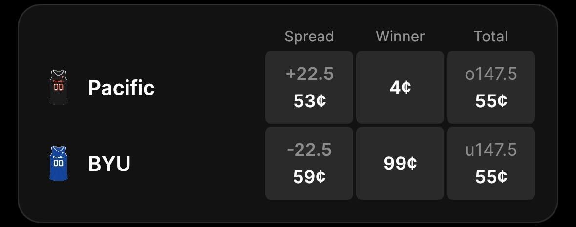 BYU favored by -22.5 points on the spread with a price of 99 cents to win and the total set at 147.5 points on Fanatics Markets.