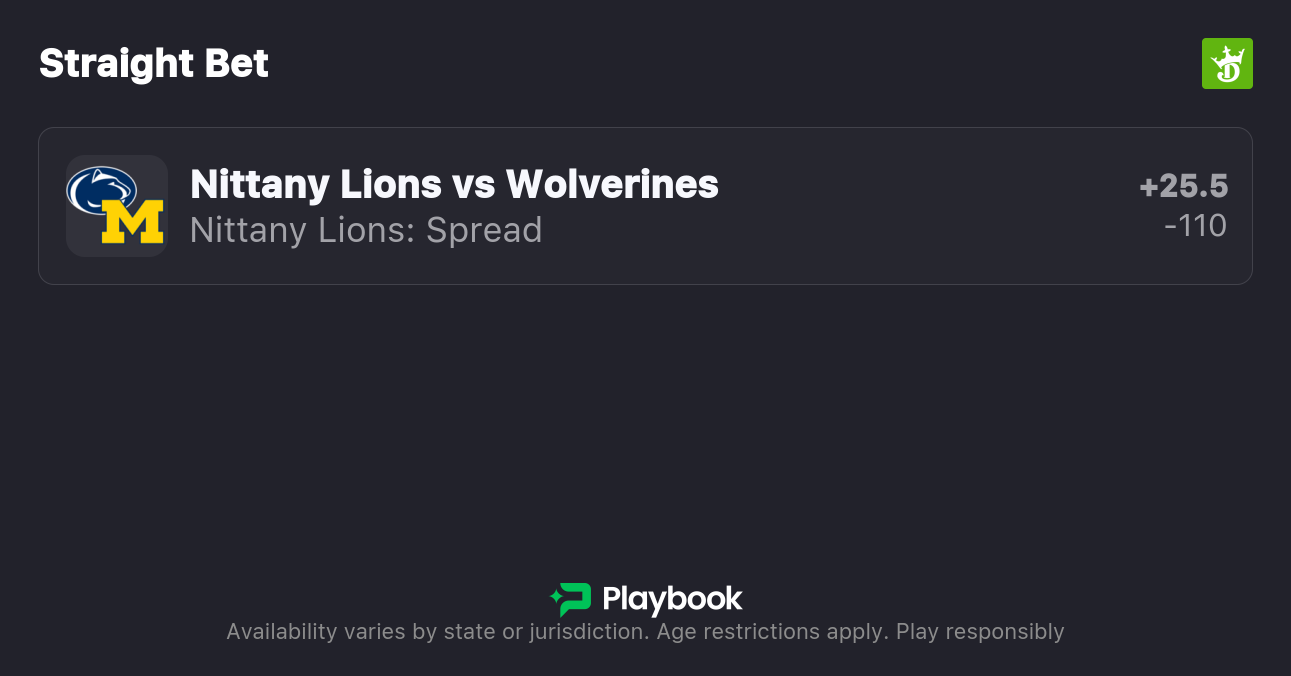 - Penn State vs Michigan moneyline: Penn State +3000, Michigan -10000