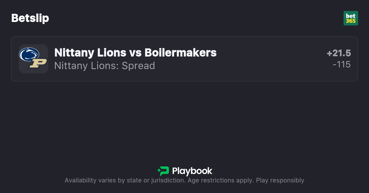 - Penn State vs Purdue moneyline: Penn State +1800, Purdue -10000