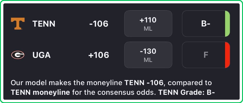 - Tennessee vs Georgia moneyline: Tennessee +110, Georgia -130