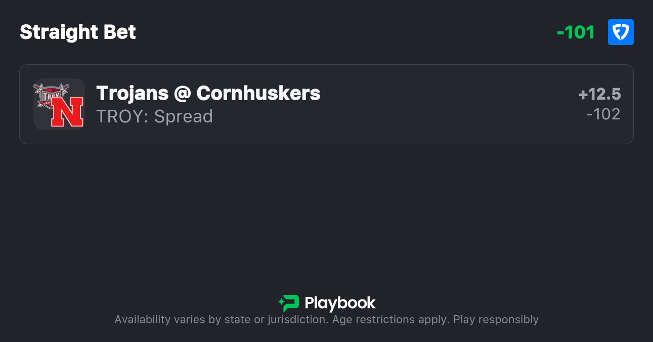 - Troy vs Nebraska spread: Nebraska -12.5