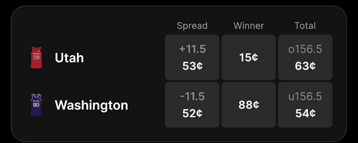 Washington favored by 11.5 points on the spread with a price of 88 cents to win and the total set at 156.5 points on Fanatics Markets.