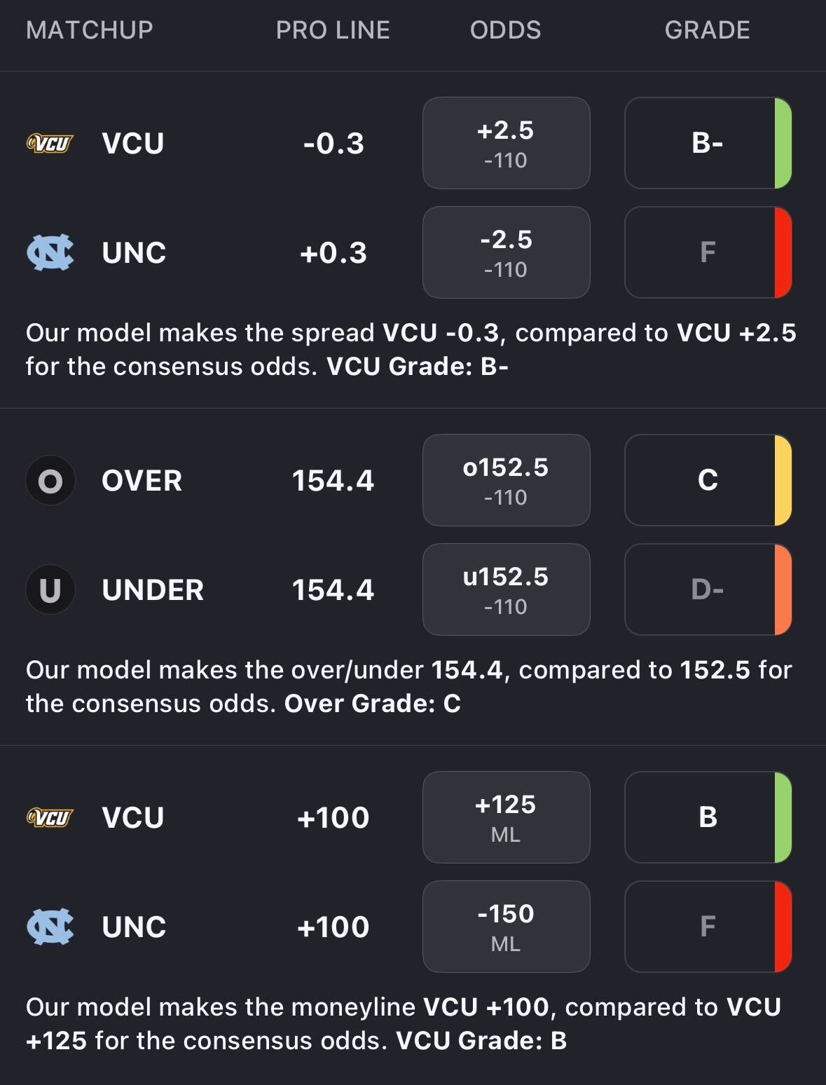 - VCU vs UNC spread: UNC -2.5