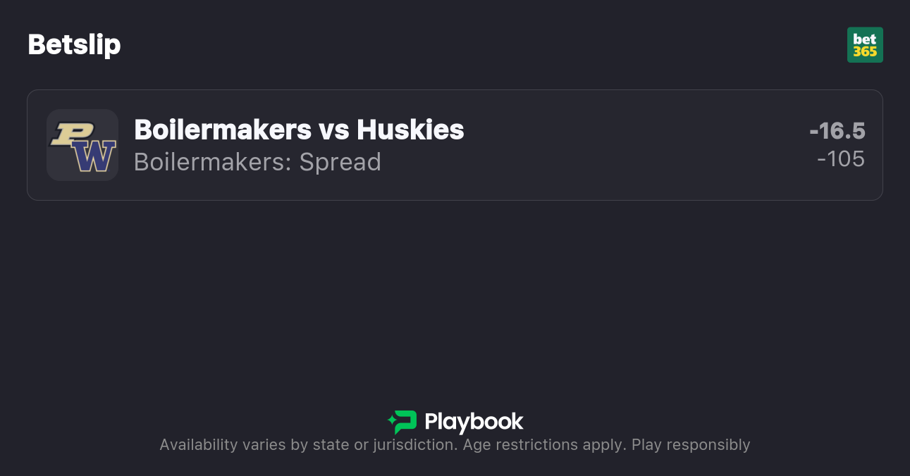 - Washington vs Purdue moneyline: Washington +1100, Purdue -2200