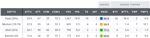 When he was allowed to aim at deep targets over 20 yards, though, the Katy, Texas, native racked up 26 big-time throws and recorded a grand total of zero mistakes.