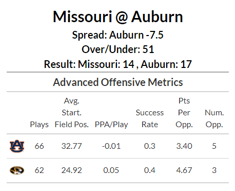 It was also outmatched in Points per Opportunity and PPA per Play. Missouri outgained Auburn by 95 yards in this game.