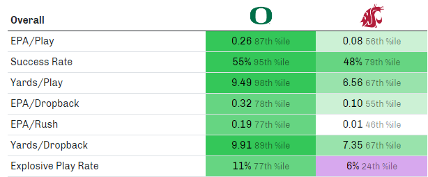 The Ducks' offense was firing on an unreal level Saturday. Next week, they face a Stanford defense that allowed 40 points to Washington and 41 to USC. Oregon’s offense ranks higher than both of those teams, according to SP+, and should be able to score against Stanford’s No. 97 defense.