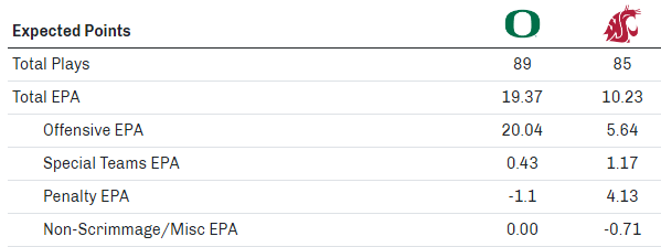 Connelly had this as a 15.1-point Oregon victory. Even with the final touchdown drive, the Ducks still outgained Washington State, 624 yards to 428. Oregon even won the turnover battle, 2-1, and still played this close somehow.