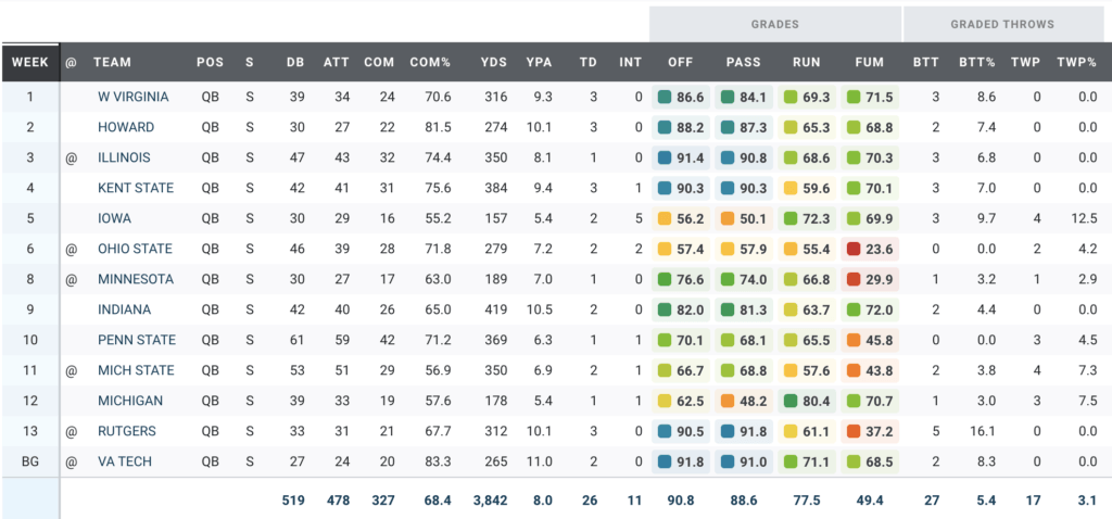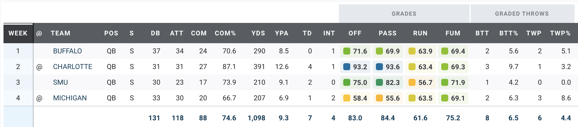Payton Thorne has been pretty bad to begin the season. His PFF passing grade sits at just 65.9 with four big-time throws and six turnover-worthy plays. However, Michigan State is still 42nd in Passing Success Rate even with those terrible numbers.