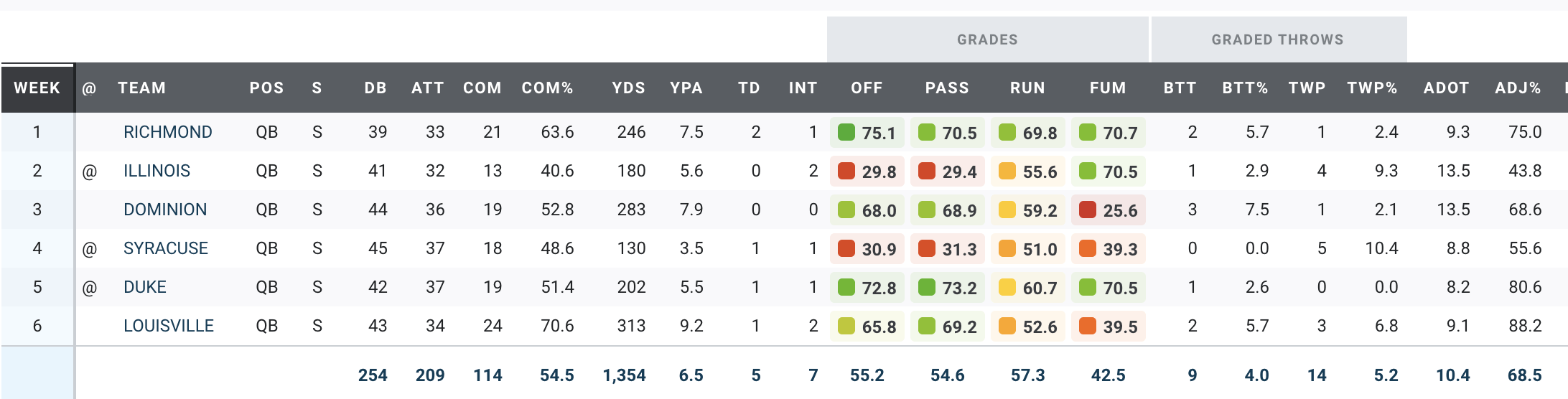 However, you have to take it with a grain of salt. In the road games against Illinois and Syracuse, he was historically bad. In those two games, he committed nine of his 14 turnover-worthy plays, averaged under 5.0 yards per attempt and had a PFF passing grade below 35.