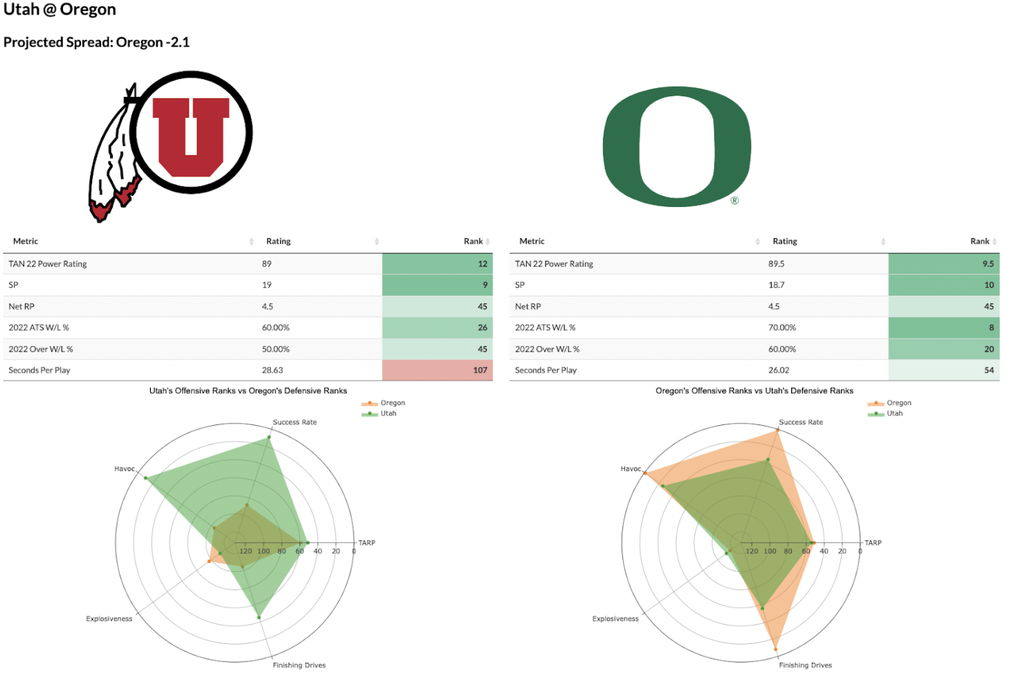 In particular, the Ducks have a chance to absolutely gash the Utes on the ground with their running game. Oregon ranks first and second in rushing play EPA/Play and Success Rate, respectively, while Utah ranks 96th and 66th defensively in those categories.