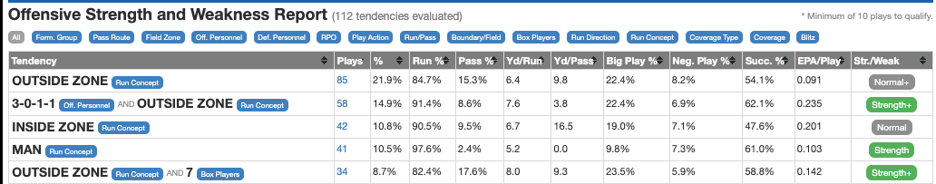 Washington is highly efficient when it runs inside zone, racking up a Success Rate of 74%. Outside zone, meanwhile, averages an explosive play on one of every four attempts.