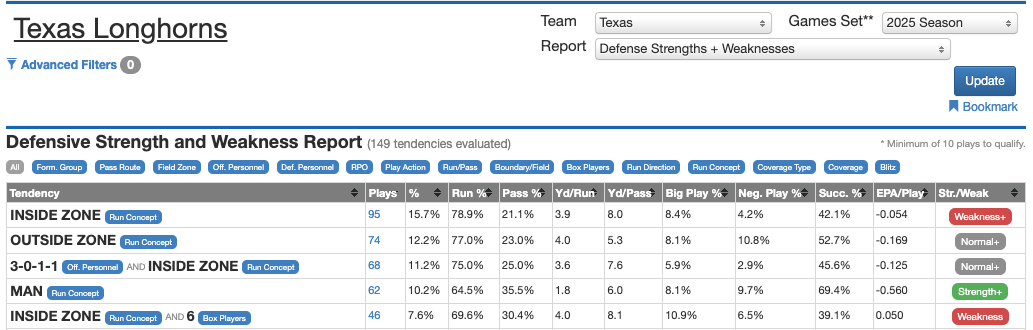 The Longhorns have been fantastic against the rush in terms of high-level analytics, ranking top-20 in defensive efficiency, Line Yards and Stuff Rate.