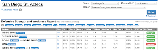 The Aztecs rank 16th in Rushing Success Rate allowed, specializing in shutting down zone read concepts. San Diego State creates plenty of negative plays, posting a 61% Success Rate against inside zone and 66% Success Rate against outside zone.