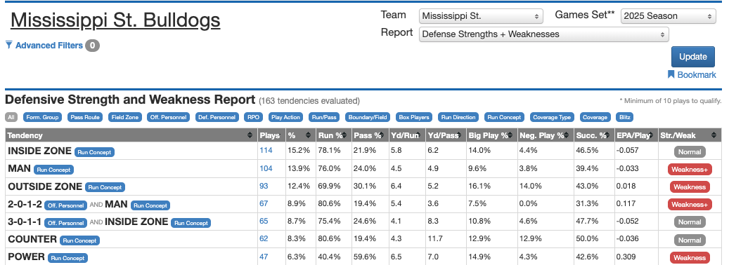 The Bulldogs rank bottom-10 in opponent rush efficiency, Line Yards and rush explosives allowed. Mississippi State has struggled against man blocking concepts with just a 39% Success Rate.