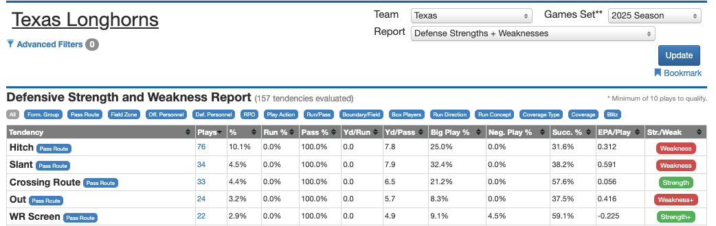 The Horns rank 79th in defending pass explosives with extreme weaknesses against hitch, slant and out routes. However, opponents using wide receiver screens and crossing routes have had the most failures.