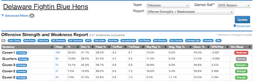 More importantly, Minicucci has struggled against Cover 1 with a 44% Success Rate and negative EPA. Liberty's 3-3-5 scheme plays a large percentage of defensive snaps in Cover 1, which will be a negative for the Blue Hens' passing