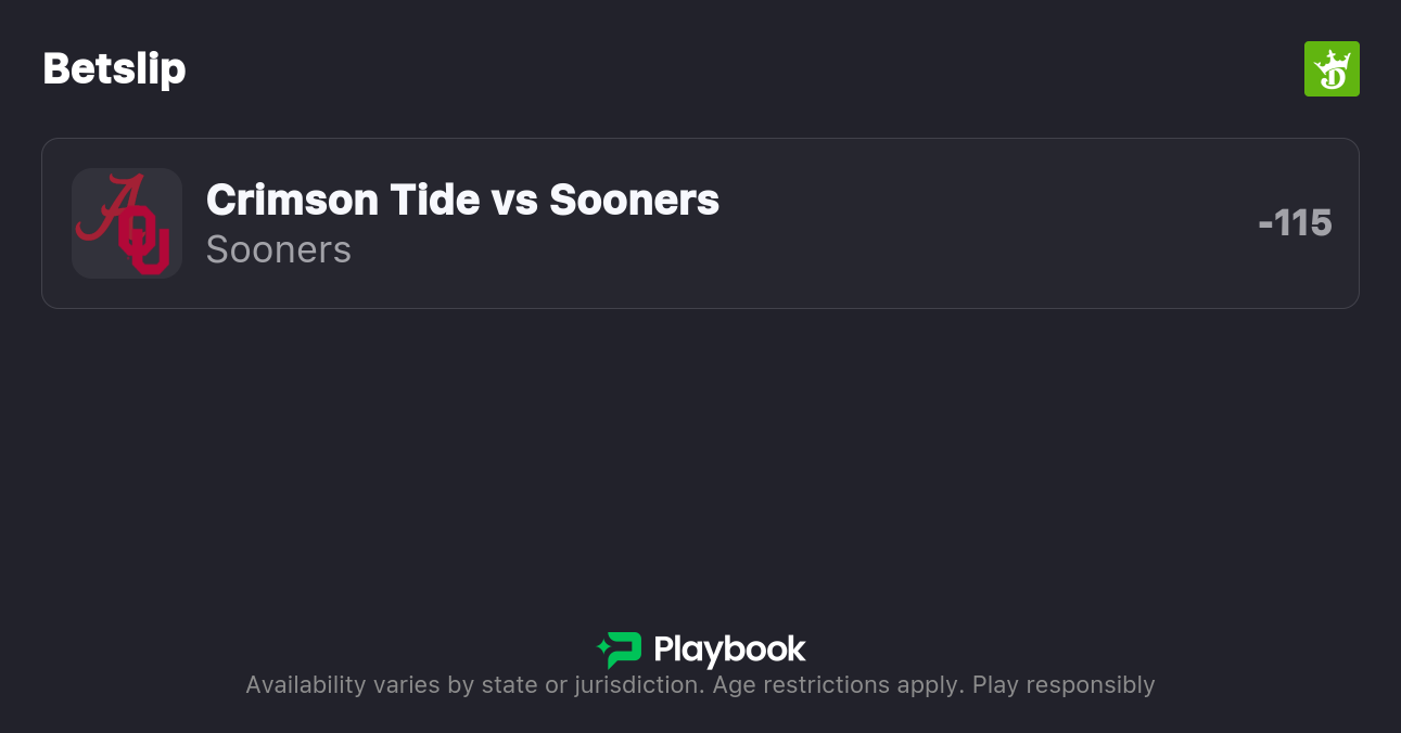 For the rematch, Alabama once again opened as a favorite, but the line shifted at most sportsbooks to make Oklahoma a short favorite.