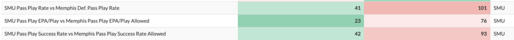 SMU pops up twice in our charts — once for Havoc and once for Success Rate. In addition to these general mismatches, there's one facet of the game where the Mustangs have a clear advantage: the passing game.