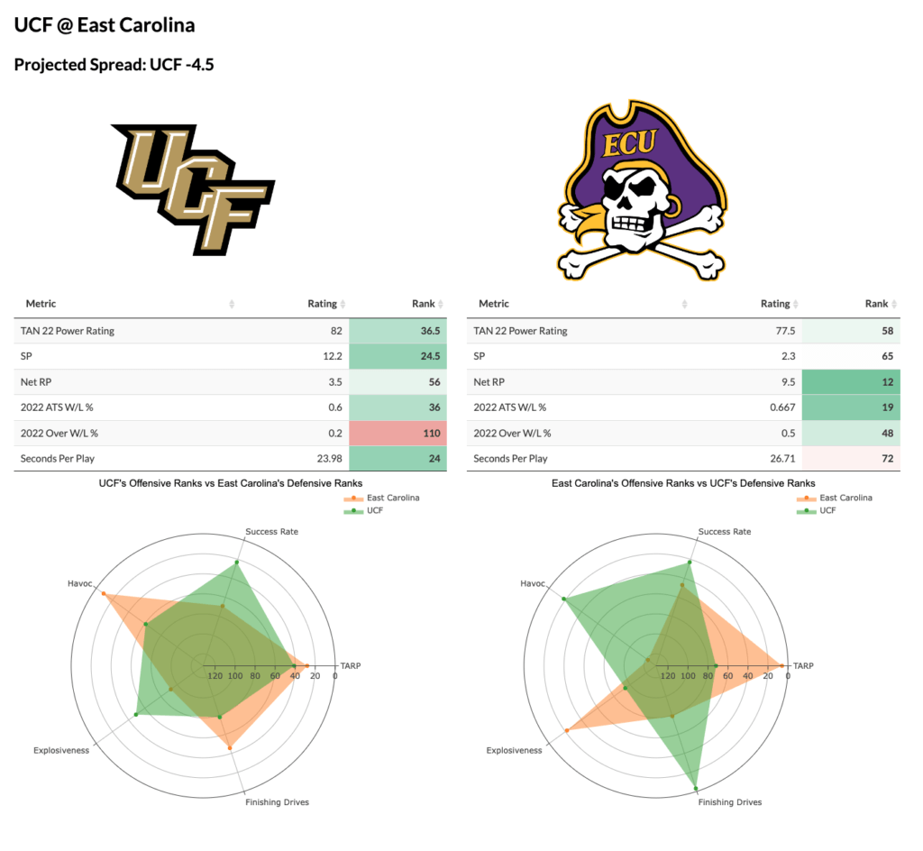 The Knights have a significant edge on defense in Success Rate, Havoc and Finishing Drives. The Pirates might have a few nice plays on the day, but overall, I expect UCF to lock them up.