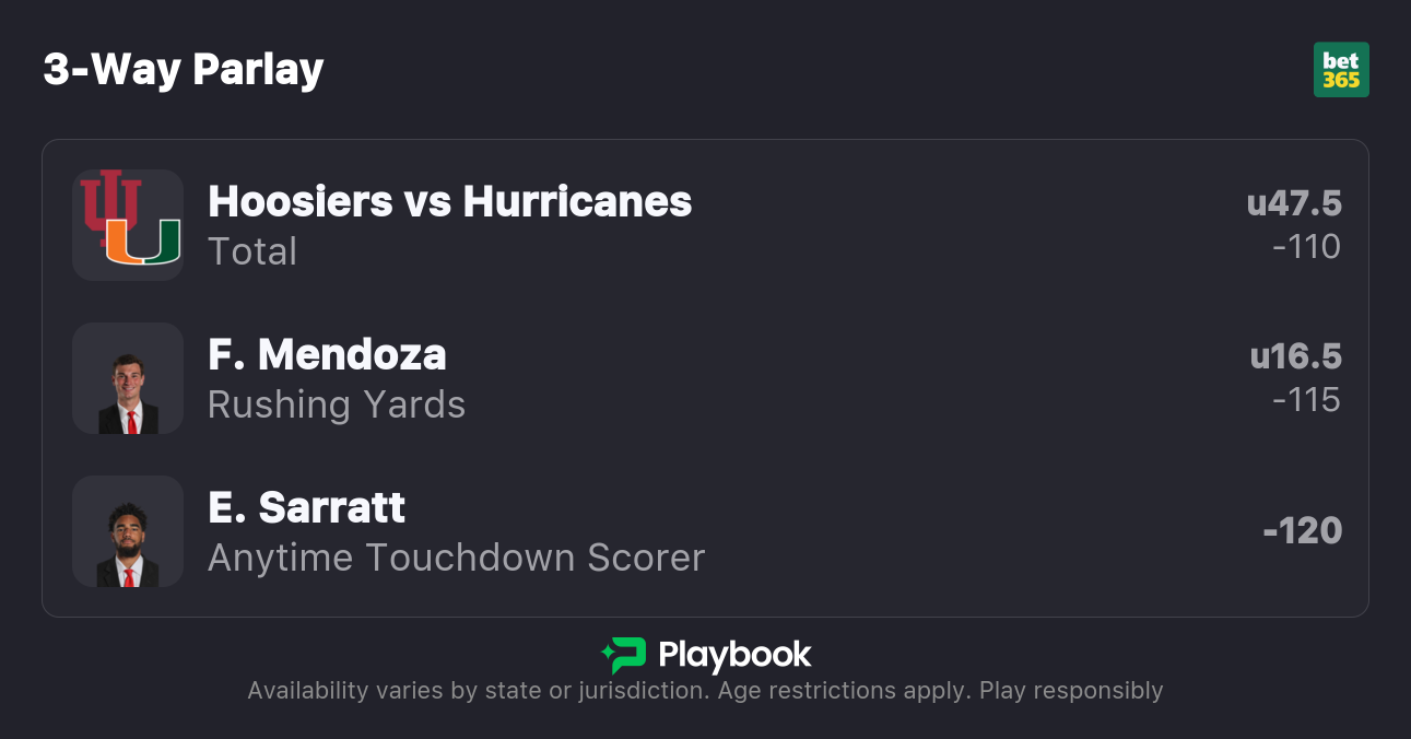 Picks: Under 48 (Play to 47) · Fernando Mendoza Under 18.5 Rushing Yards (Play to 15.5) · Elijah Sarratt Anytime TD (-115)