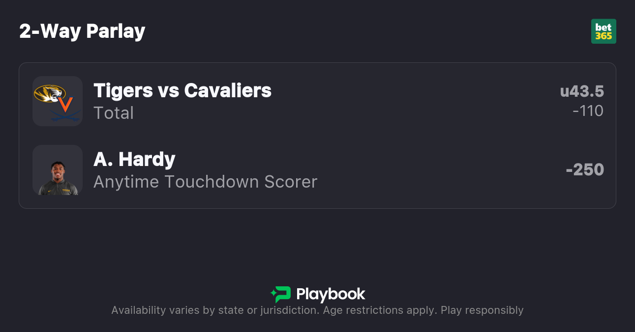 I expect Virginia to struggle to string together possessions, and I also anticipate a heavy workload for Hardy in Missouri's rush-heavy game script.