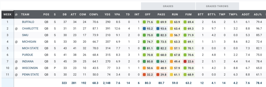 CJ Stroud is still the favorite to win the Heisman Trophy, and it's easy to see why. He owns an 83.9 PFF passing grade and has thrown for 34 touchdowns to four interceptions. He's also put up a whopping 9.9 yards per pass attempt.