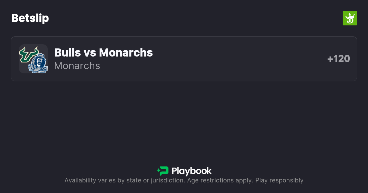 - Old Dominion vs USF Moneyline: Old Dominion +120, USF -142
