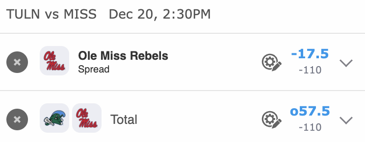 - Ole Miss vs. Tulane Spread: Ole Miss -17.5, Tulane +17.5