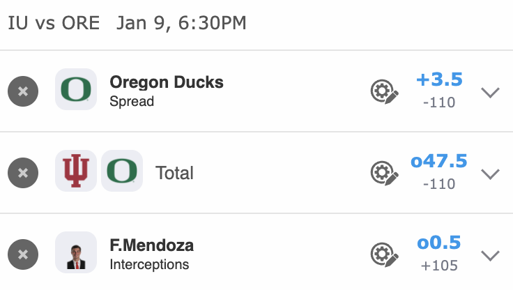 - Oregon vs. Indiana Pick: Oregon +4 · Over 48.5 · Mendoza Over 0.5 Interceptions (+105)