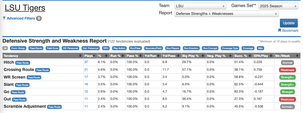 LSU has struggled mightily against crossing routes, allowing a big play on every other attempt.