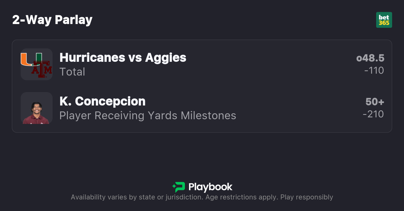 I came through with a 2-leg same-game parlay for the first round of the College Football Playoff, including an over/under pick and a player prop for Texas A&M wide receiver KC Concepcion.