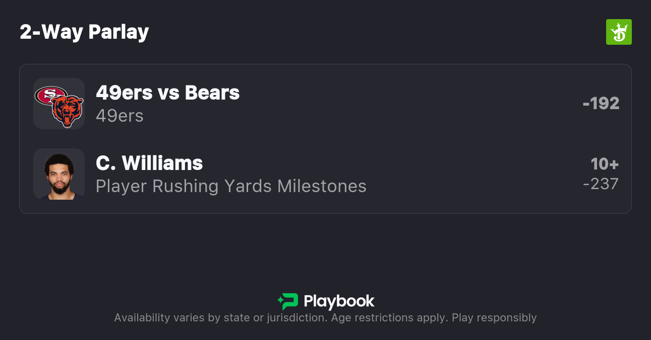 Continue below for Sunday Night Football odds and my 49ers vs Bears parlay, which includes picks for the moneyline and a Caleb Williams prop.