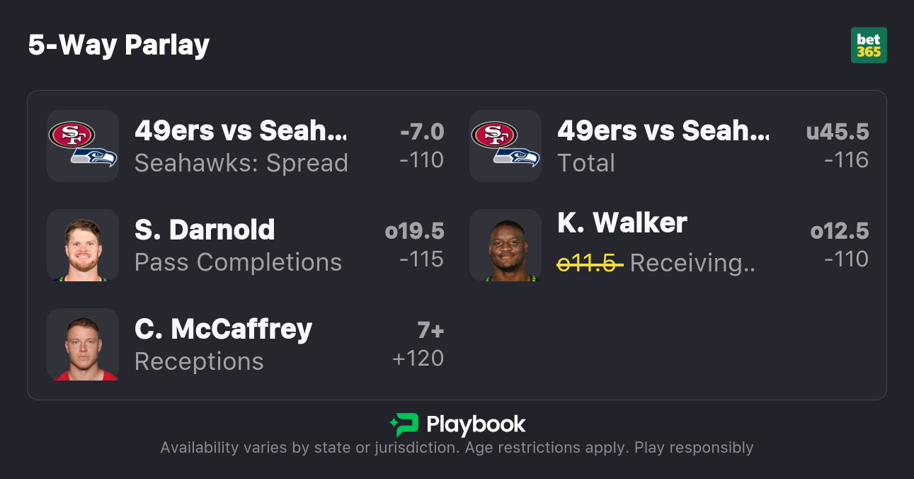 The Seahawks are 7-point favorites over the 49ers on the spread (Seahawks -7), with the over/under set at 45 total points. Seattle is a -330 favorite to win outright on the moneyline, while San Francisco is +265 to pull off the upset.