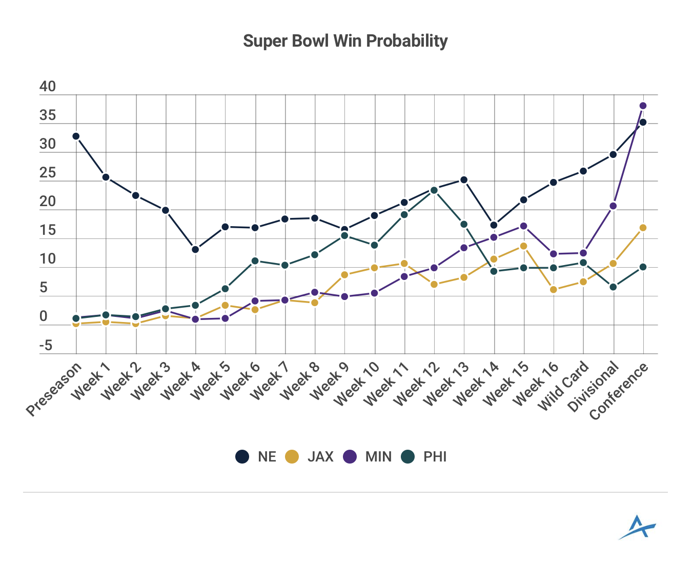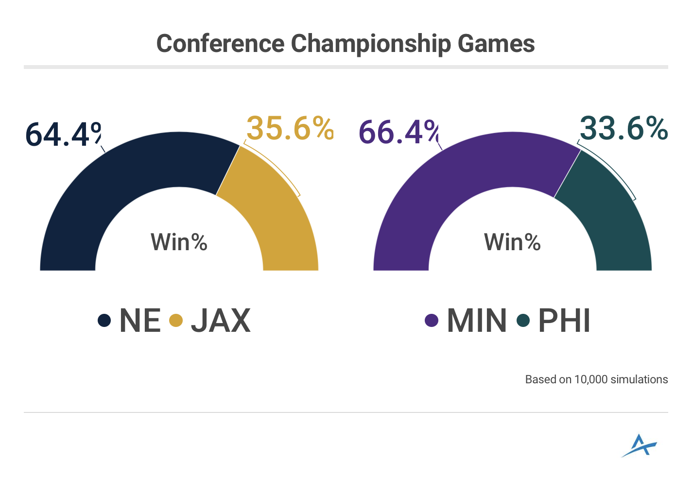 With a greater chance of advancing to the Super Bowl and playing for the championship in Minnesota, the Vikings have a 38.1% chance of lifting the Lombardi Trophy followed by the Patriots (35.1%), Jaguars (16.8%) and Eagles (10.0%).