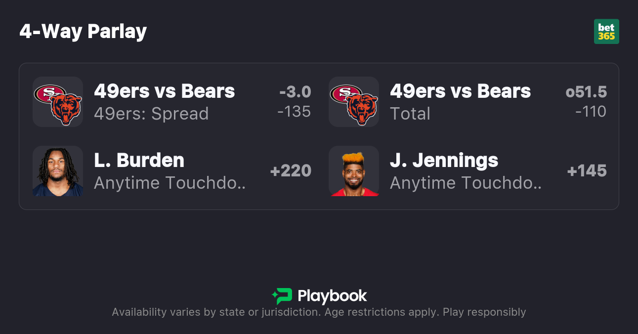 - Bears vs 49ers Moneyline: Bears +160, 49ers -190