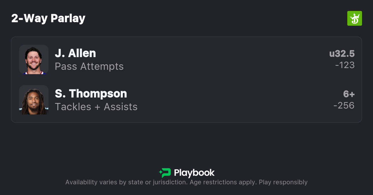- Josh Allen Under 33.5 Pass Attempts (-128 at DraftKings)
