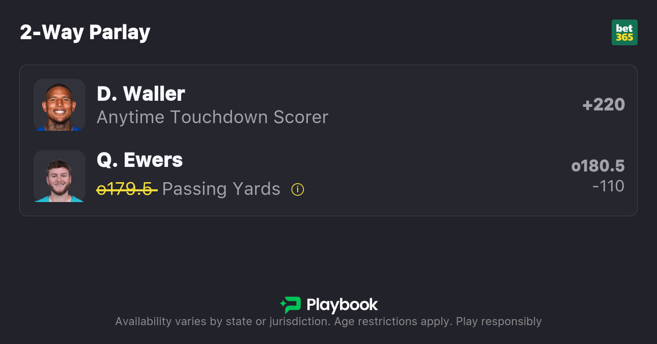 We don't know how Quinn Ewers will play, but the total is decent for this game, and the Dolphins are 4-point underdogs, so we can expect him to throw a decent amount. I have the true anytime touchdown odds on Waller under +300.