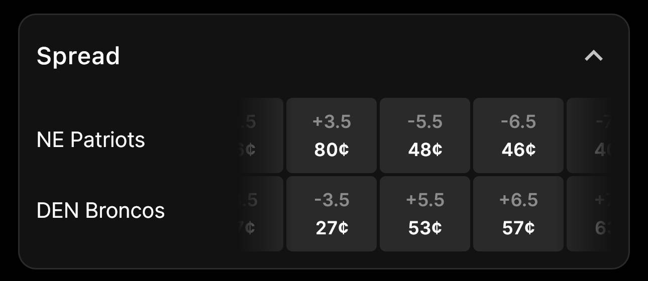 The Patriots opened as a -5.5 point favorite over the Broncos and are favored at 70 cents to win. Meanwhile, the Broncos are priced at 33 cents on Fanatics Markets to pull off the upset. The total is set at over/under 41.5 total points scored.